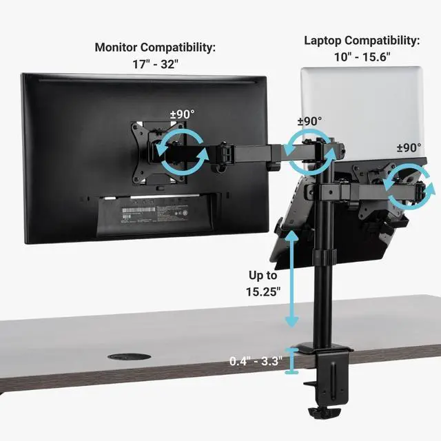 SPACE OPTIMIZATION: With the ±90° base, elbow, and neck joint rotation, along with the ±45° monitor tilt adjustment and the 360° VESA mount rotation, this monitor mount allows you to turn the screens vertically or horizontally, optimizing space.