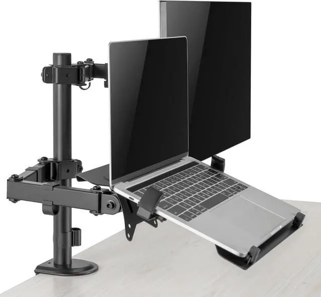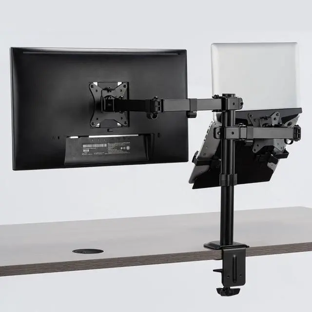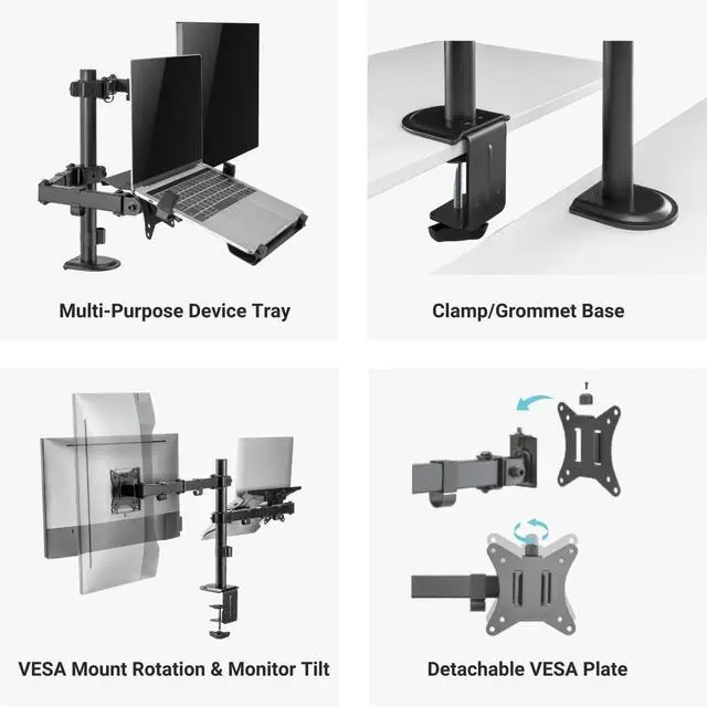 ATTACHABLE LAPTOP MOUNT: This multi-device tray supports laptops, tablets, and keyboards, allowing you to easily arrange a dual-screen setup. The tray has silicon pads for secure protection and strong adjustable claws, which firmly hold your devices.