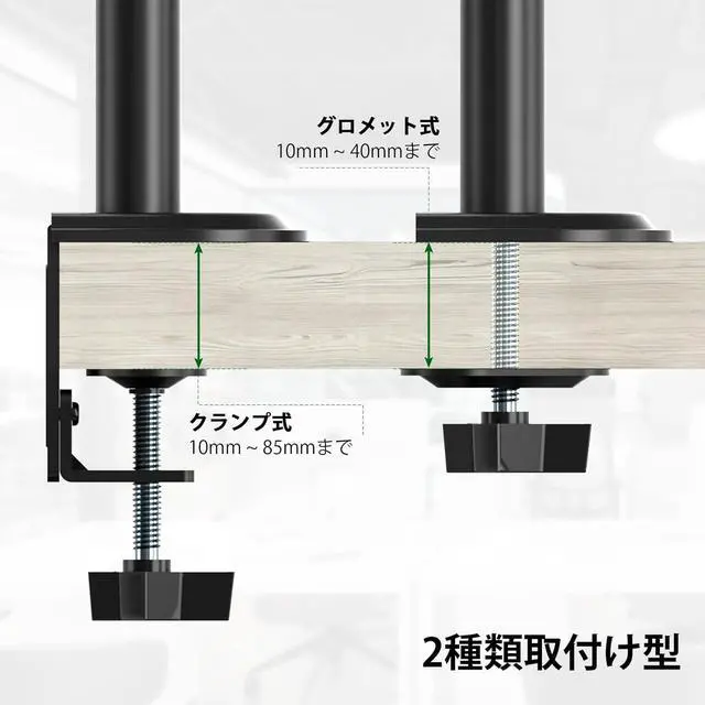 [Installation Method] There are two types of mounting methods, including clamping and screw-fixed (grommet), and each desk thickness is compatible with 0.4 - 3.3 inches (10 - 85 mm) and 0.4 - 1.6 inches (10 - 40 mm)