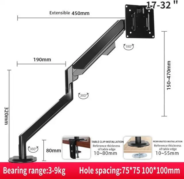 Fits Screens Size - Single monitor mount fitting most screens 17 to 32 in size and up to 19.8 lbs in weight with VESA 75x75mm, 100x100mm. Secures to your desk with heavy duty C-clamp or optional grommet mount.