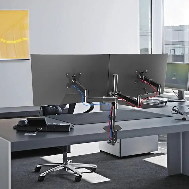 DECENT CABLE MANAGEMENT: Each arm of dual monitor has cable clips along it, whic helps with cable management.