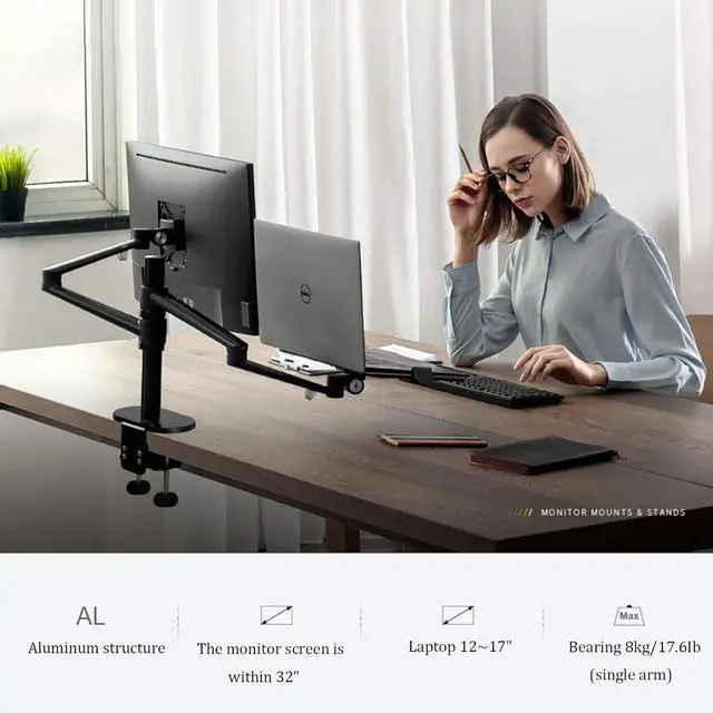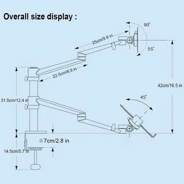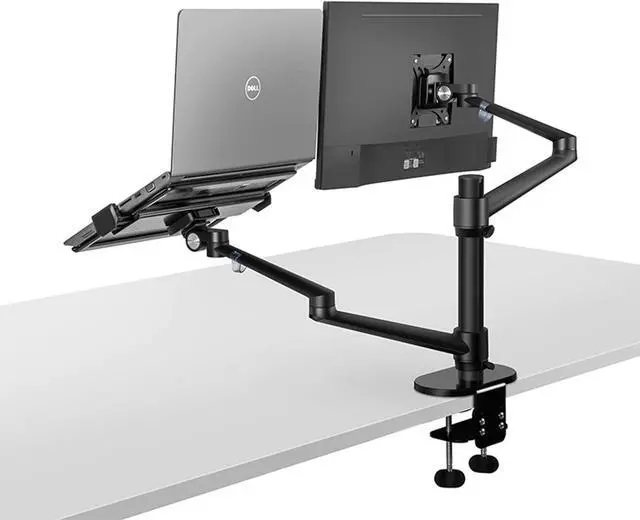 ADJUSTABLE -- The screen can freely swivel 360 degrees, monitor mounting arm offers 145-degree tilt, the maximum extension length up to 47.5cm/18.7", reach the height of 43cm/16.9", Laptop mounting arm offers 45-degree tilt, the maximum height up to 42cm/16.5".