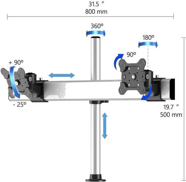 Accommodates various display sizes; slide screens into place to align edges. May rotate, tilt and swivel each screen independantly. Rotation: 90 degree, Tilting: Backward -90 degree/+25 degree Forward, Swivel: 360 degree