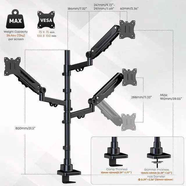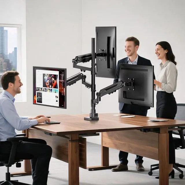 Independent Gas Spring Arms for Precise Control: Three fully independent arms allow smooth height, tilt, and depth adjustment, maintaining perfect balance even with mixed monitor sizes