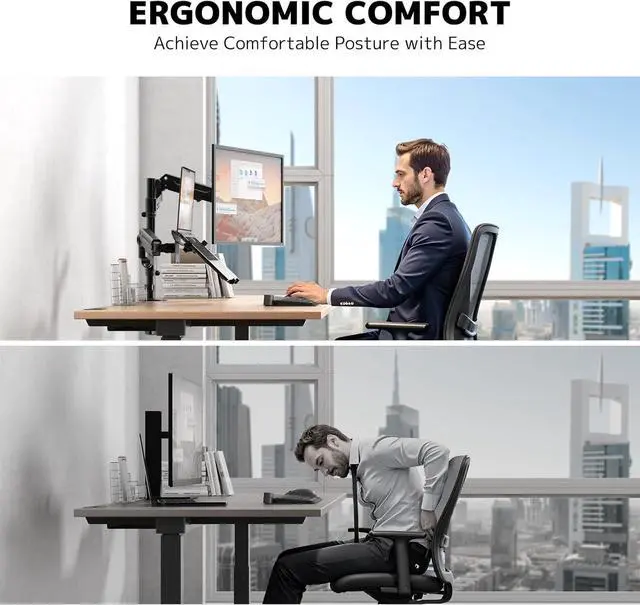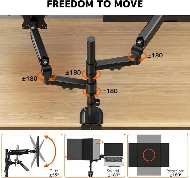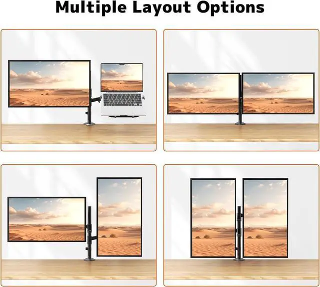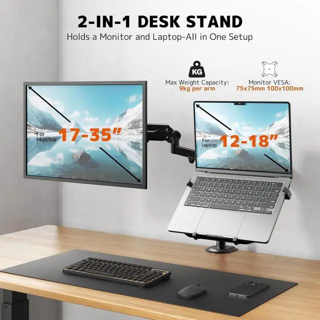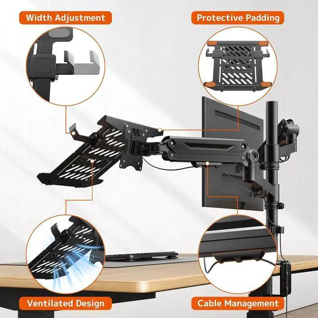 1Monitor Laptop Desk Mount2Space-saving Design3Cable Management42 Mounting Options5Removable VESA plate 2-in-1 Monitor and Laptop Mount Premium Monitor and Laptop Mount Customize workstations with different combinations. Neat Cable Management C-clamp and Grommet Mounting Options Removable VESA plate for easy installation.