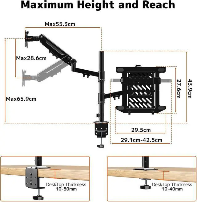 1Full-range Adjustment2Parameter3Tension Adjustment PUTORSEN dual monitor arm offer comfort and durability for desktop setups, whether you want to stack monitors vertically or position them side by side.