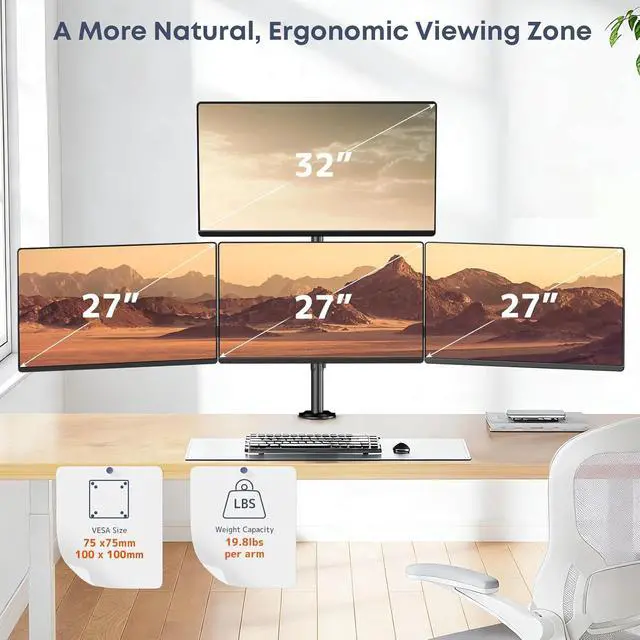 Heavy Duty Steel Support for 4 Screens: This quad monitor mount is constructed from reinforced steel to securely hold up to four monitors; The top monitor supports screens from 1732 inches, while the lower three monitors support up to 27 inches each; Maximum load capacity is 19.8 lbs per screen; Compatible with VESA 75 x 75 mm and 100 x 100 mm mounting patterns