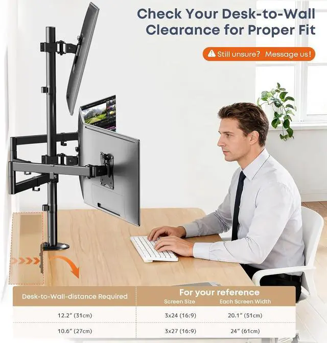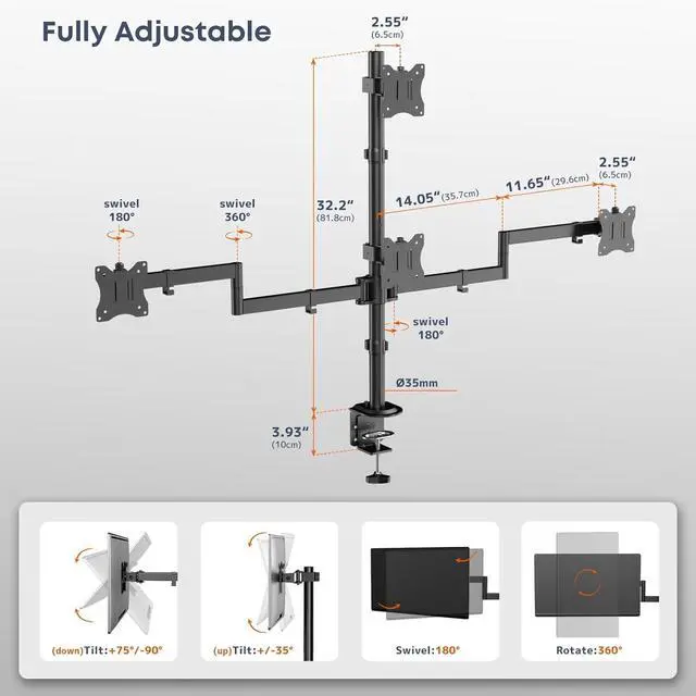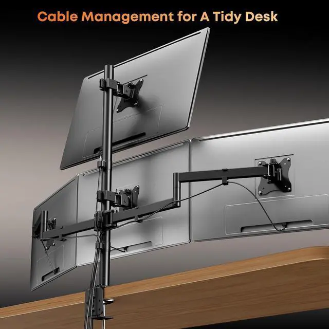 Fully Adjustable Viewing Angles: Each monitor arm supports tilt, swivel, and 360° rotation, allowing you to customize viewing angles for work, gaming, or content creation; The vertical stacking design helps maintain eye-level alignment, while independent arm adjustment ensures precise positioning for all four screens