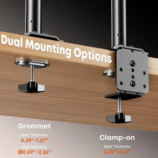 Clamp & Grommet Mounting Options: Includes both C-clamp and grommet mounting hardware to fit a wide range of desks; Clamp fits desk thickness from 0.39" to 3.14", while grommet installation supports thickness from 0.39" to 1.57"; Suitable for home offices, professional setups, and gaming desks