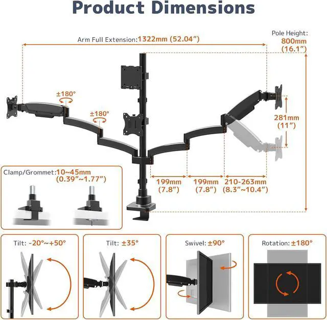 Fully Adjustable Desk Mount: Center bracket tilts +50°/-20°, while lower arms tilt ±35°. All brackets rotate 360° and swivel 180°. With a 1322 mm gas spring extension and center pole height adjustment, you can effortlessly position your screens to eliminate neck, spine, and shoulder strain.