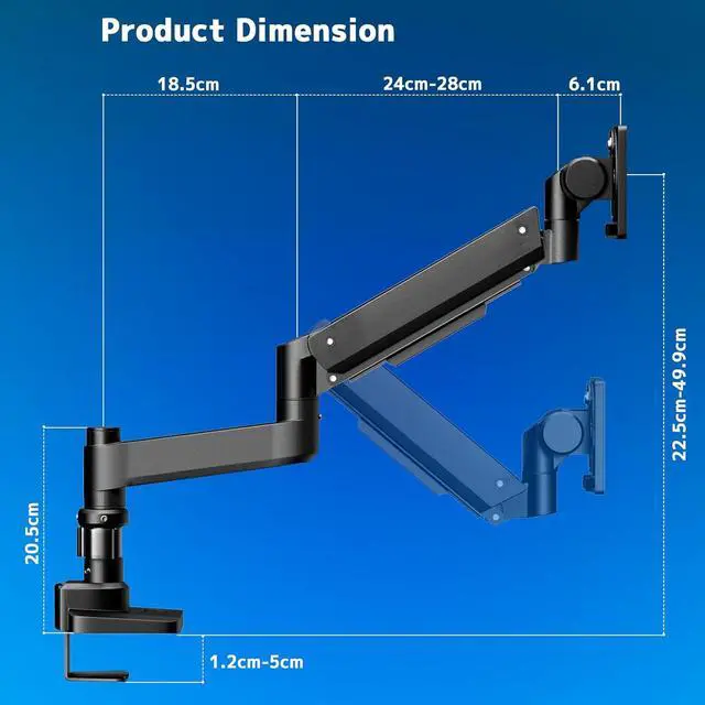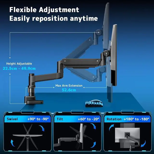 Angle & Height Adjustment: Features ±90°swivel, +60°/-20° tilt, ±90° rotation for superb flexibility,Maximum arm full extension 526 mm and maximum height 499 mm from the work surface;ideal for gaming, multitasking, or stacked setups