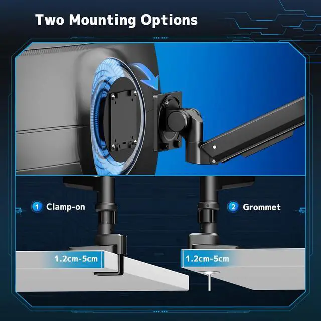 Two Mount Options: 1) Heavy-duty C-clamp (fits desk thickness 12mm-50mm) keeps your screen fixed firmly and safely in place; 2) Grommet base (fits desk thickness 12mm to 50mm) offers supreme stability