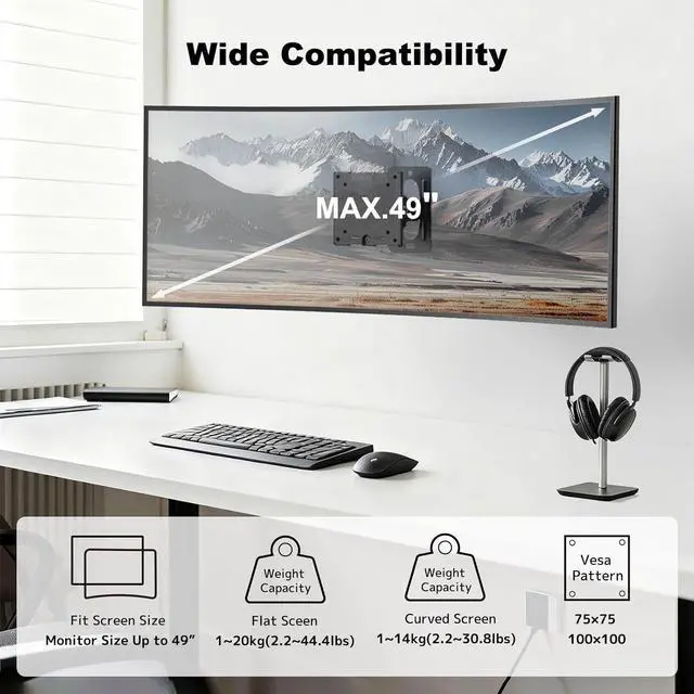 Wide Compatibility & Strong Support:Fits most 1749 inch flat and curved monitors,Holds flat screens up to 44.4lbs and curved screens up to 30.8lbs.Supports VESA 75x75 and 100x100 mm