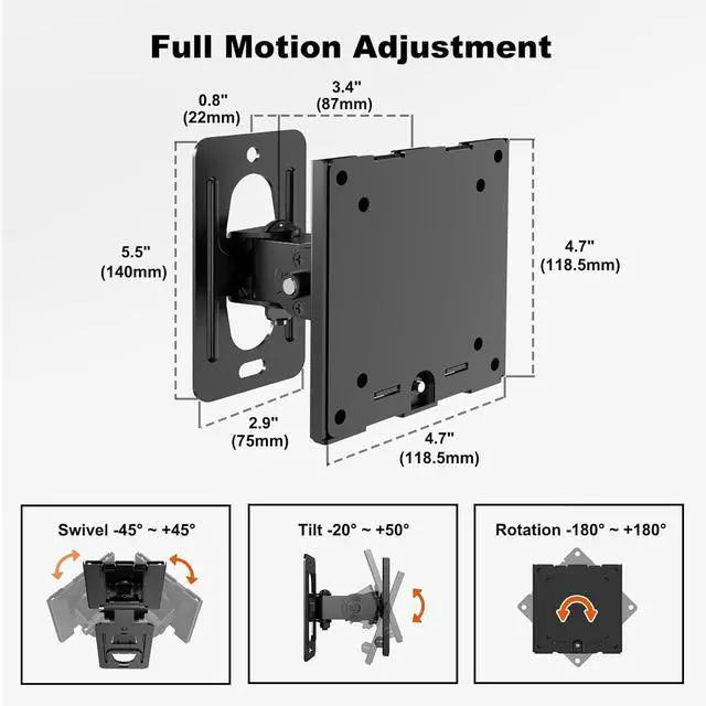 Full Motion Flexibility:Adjust your screen with swivel ±45°, tilt -20° to +50°,and rotation ±180°