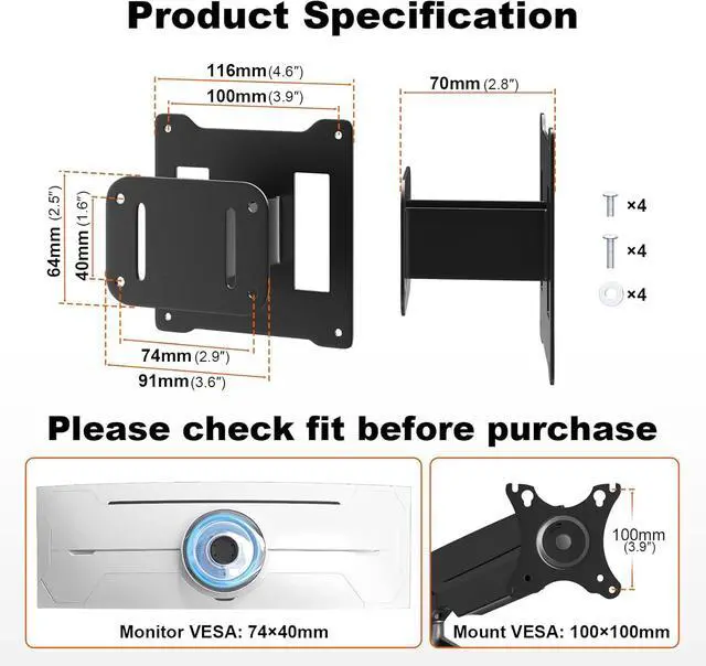 Product SpecificationsThe monitors VESA pattern is 2.91x15.7 inch(74x40mm), while the adapter supports a 100x100mm VESA standard. (Make sure to verify your monitors compatibility before ordering!)