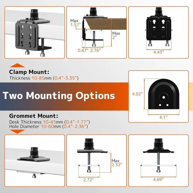 Ultra-Sturdy Steel Construction: Built with heavy-duty steel for maximum durability, featuring a clamp base that fits desks 0.4" to 3.15" thick and a grommet base that fit desk 0.4" to 1.57" and reinforced joints to prevent monitor sagging