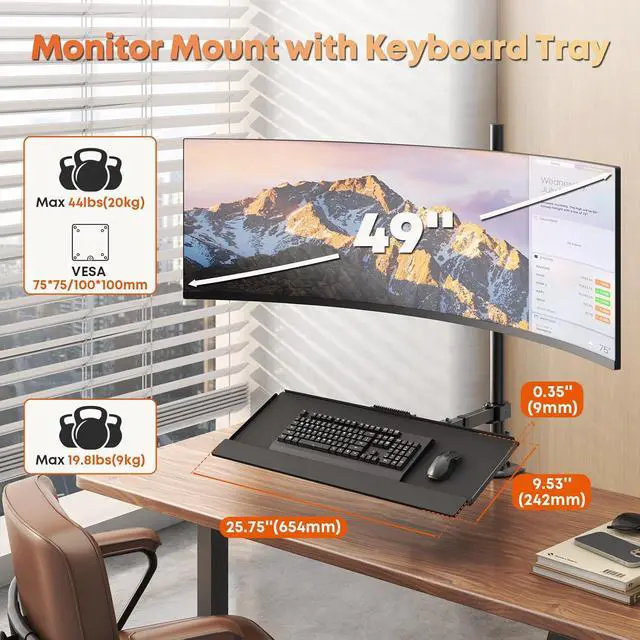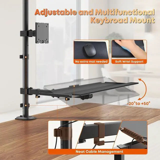 PUTORSEN 49''Monitor Arm with Keyboard Tray, Sit Stand Monitor Desk Mount, 20 kg Monitor& 9 kg Tray Capacity, C-Clamp & Grommet Mount,Standing Workstation Option