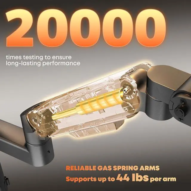 Built to Last, Sturdy & StableThis mount is crafted from high-quality Aluminum, providing excellent support and lasting stability. Whether you frequently adjust your monitor or keep it stationary, it will maintain smooth and stable performance. The internal gas spring system has undergone over 20,000 fatigue tests to ensure its durability and long-term reliability, keeping your monitor securely in place day after day. Its a reliable and durable solution for your workspace, providing consistent performance for years