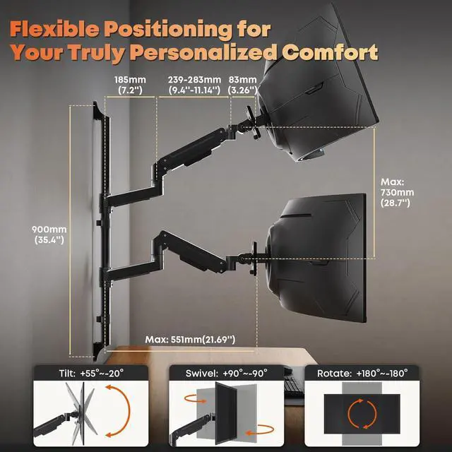 Full Adjustability & Extended 90CM PoleWith this mount, you can enjoy a high degree of freedom in adjusting your monitor. The ultra-smooth dual-arm movement takes flexibility to the next level. The mount offers tilt adjustments from +50° to -20° tilt, +90° to -90° swivel, +180° to -180° rotation,with a maximum extension of 55CM. Whether you need to adjust the height of your monitor or rotate it for different viewing angles, you can easily find the most ergonomic position. This helps reduce neck and back strain during long hours of screen use, improving work efficiency and maintaining a comfortable posture