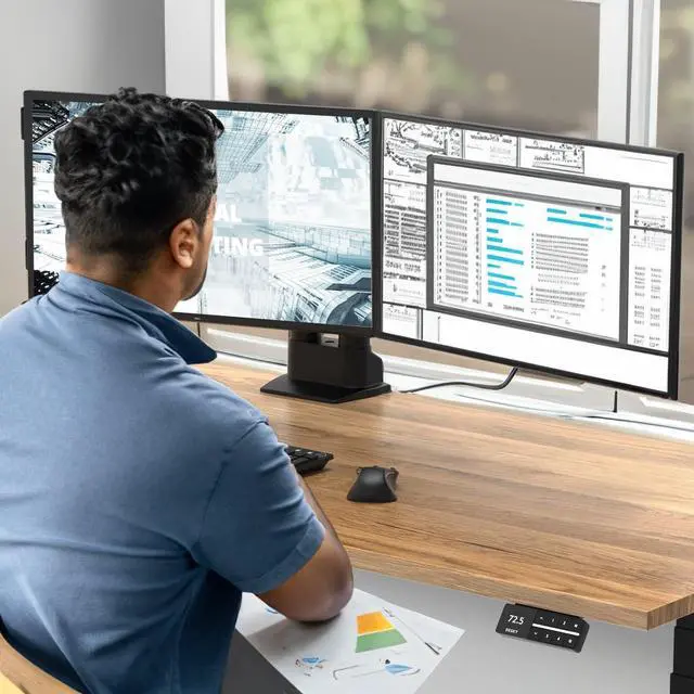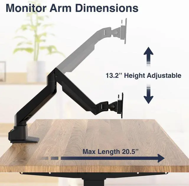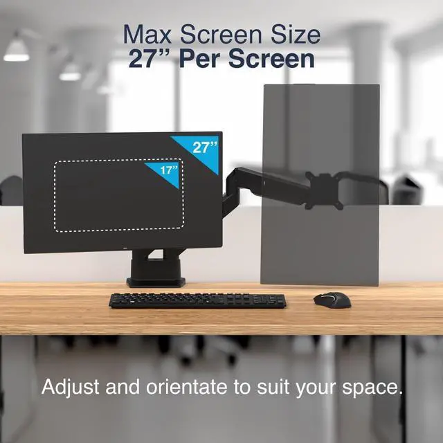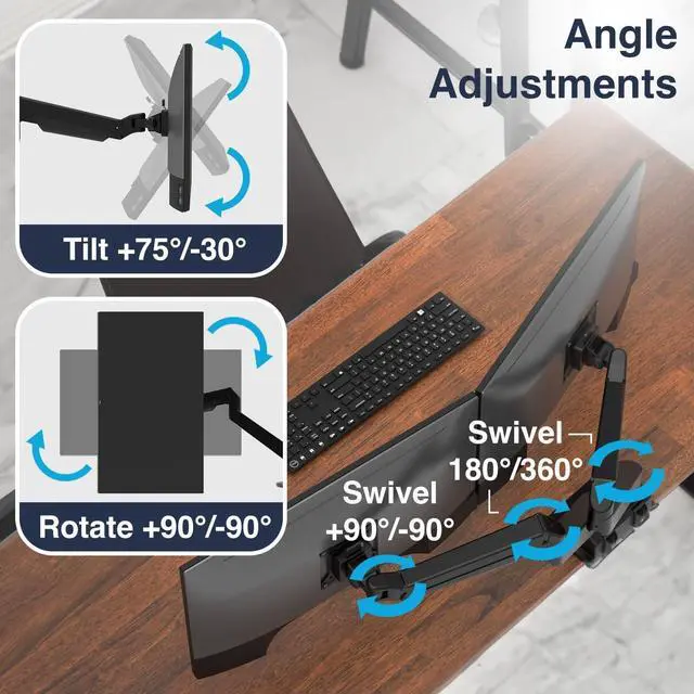 FULL RANGE OF MOTION Experience the perfect dual monitor setup with complete flexibility. Our double-jointed arms and 360-degree rotary VESA stand mounts provide infinite positioning options for the optimal viewing angle for your dual monitor desk mount.