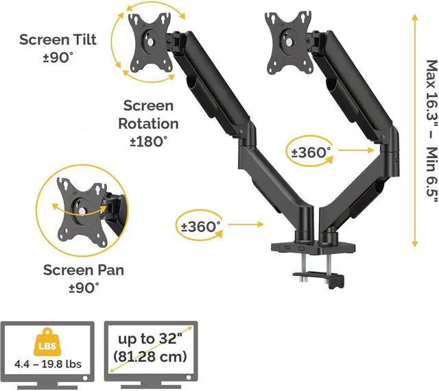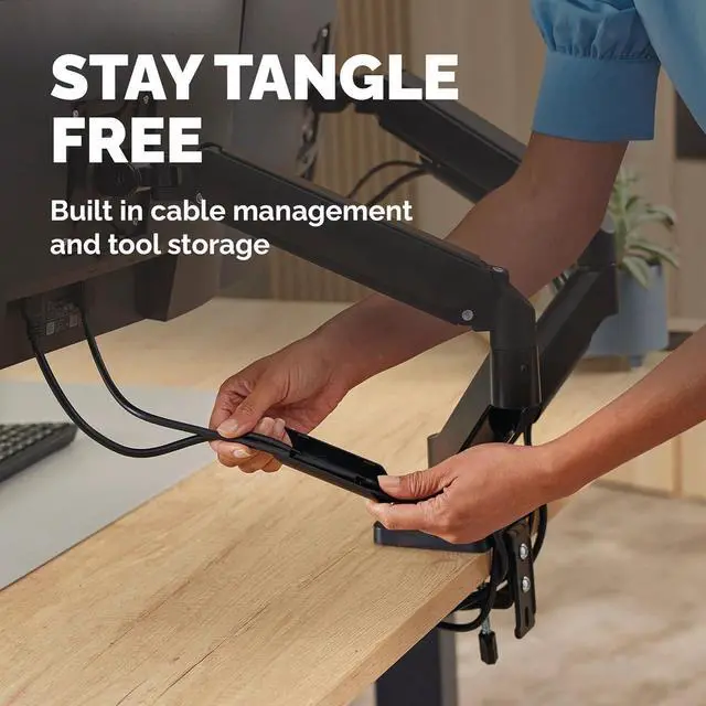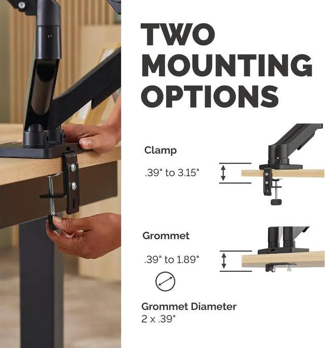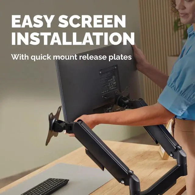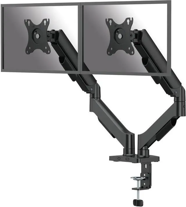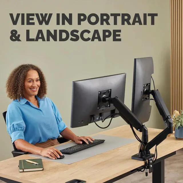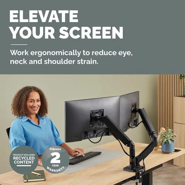 Streamline your dual-monitor workspace with the Fellowes Everyday Plus Dual Monitor Arm, offering advanced gas spring adjustment for fluid, precise positioning. Designed for two 1732 monitors weighing up to 19.84 lbs each, it delivers ergonomic comfort and a clutter-free desk. Each arm adjusts to a height of 16.34" and a reach of 19.92". Full tilt range of +/-90° helps reduce neck strain and improve visibility. Installation is fast with clamp or grommet options, and the quick mount system allows for effortless monitor setup. Built-in cable management completes the clean, professional look. Fully compatible with VESA 75x75 and 100x100 patterns.