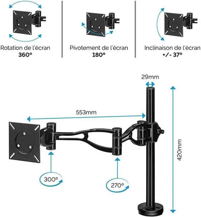 Minimum reach of 21/2 Inches to a maximum reach of 21-1/2 Inches, tilts up or down +/- 37° and freely swings left or right (360° rotation capability)