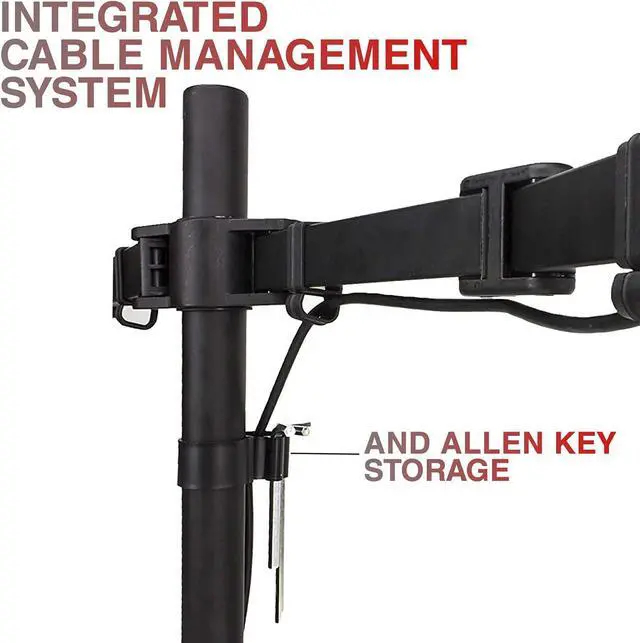 Offers adjustable arms that offer -90 degrees to +90 degrees tilt, 360 degrees swivel, and 360 degrees rotation, and full articulation. Integrated cable management along the arms and pole.
