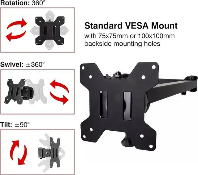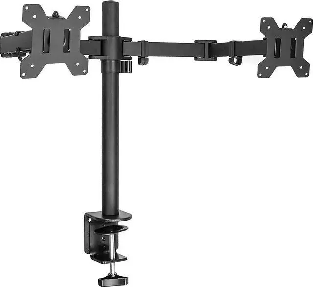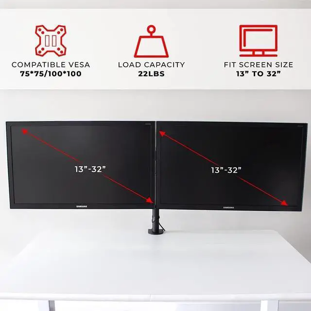 Set up your monitors properly for ergonomic benefits Increase viewing comfort, help reduce eye, back and neck strain. Achieve a more ergonomic and comfortable viewing experience. Suitable for most desks with adjustable clamp height (normally any desk at least 1" in thickness will be sufficiently strong) Cable management feature routes cables under the arm and down the pole, out of the way and letting you keep your desk clean and tidy Oversized, heavy-duty mount designed to fit ALL sizes of monitors: 13-32 inches, as long as they are VESA compatible (standard bolt pattern on the back of the monitor). Heavy Duty Dual Monitor Mount, compatible with monitors with 75x75mm or 100x100mm VESA mounting holes