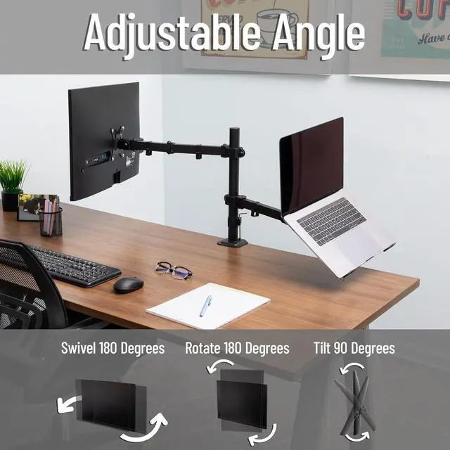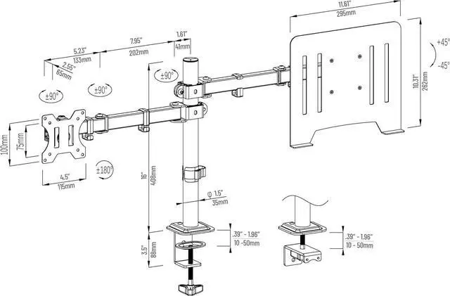 Enjoy full motion flexibility with 180° rotation, ±90° swivel, and ±90° tilt for personalized comfort. Built-in cable management keeps your setup tidy, while the C-clamp or grommet mount ensures a secure fit to your desk. With a loading capacity of 28 kgs (4.4317.6 lbs) per arm, this mount provides solid support for both monitors and laptops.
