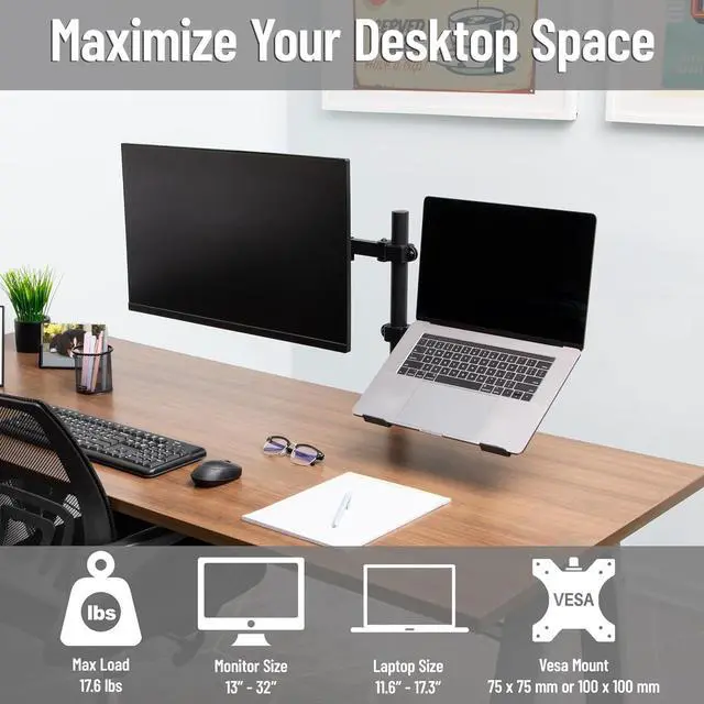 Optimize your workstation with the Mind Reader Dual Arm Monitor and Laptop Desk Mount, built for 17"32" screens and laptops. This space-saving mount delivers smooth, effortless adjustmentshelping you find the perfect viewing angle for work or play.