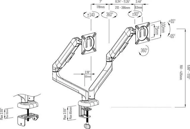 Strong Support: Each arm holds up to 19.8 lbs (9 kg) and fits most 13"32" monitors with VESA 75x75 or 100x100