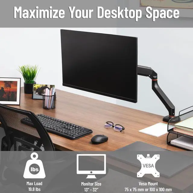 Mind Reader Counter-Balance Gas Spring Monitor Arm, 13"-32" Single Desk Mount, 180° Rotation, Tilt ±65°, Swivel ±180°, VESA 75x75/100x100, 19.8 lb Load, Cable Management, Black