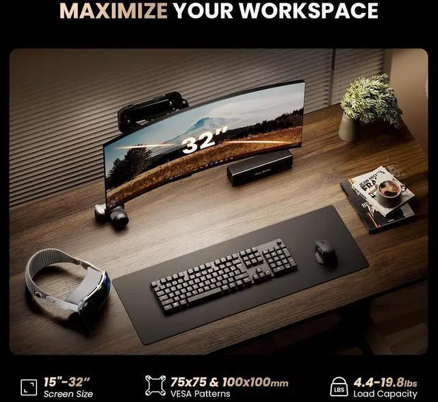 Maximize Your Workspace: This sleek VESA monitor mount (75x75mm and 100x100mm) frees up valuable desk space for essential office accessories, while its built-in cable management keeps your workspace neat and clutter-free.
