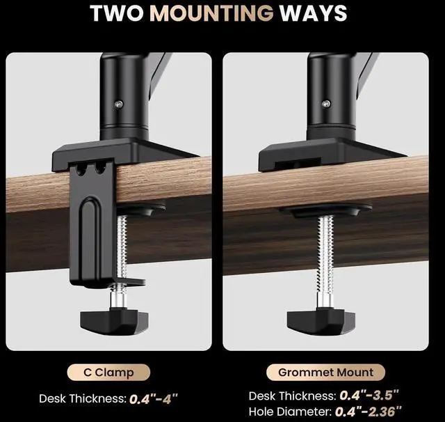 Two mounting ways: SIAGO monitor arm supports both C-clamp and Grommet Installation. For grommet installation, ensure the wooden tabletop is between 0.4 and 3.5 inches thick, with no beams or panels beneath that could obstruct the process. The tabletop thickness for C-clamp mounting should range from 0.4 to 4 inches.