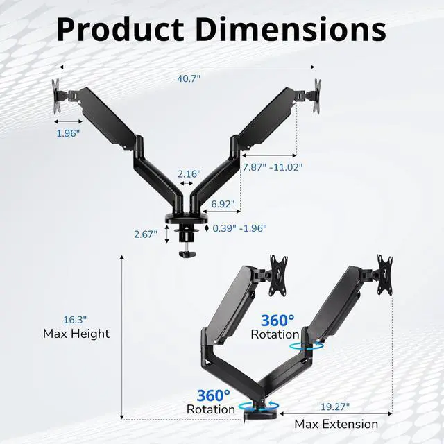 • Maximize Your Desk Space The built-in cable management keeps wires hidden and organized, while the dual monitor arm lift