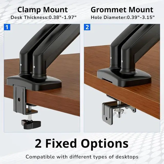 5-Minute Quick InstallationSet up your dual monitor stand effortlessly with our clear instructions. Simply select the sturdy desk clamp (fits 0.39"-3.34") or grommet mount (fits 0.39"-3.34"). No tools or expertise required youll have a secure, fully adjustable dual monitor arm ready in minutes, transforming your workspace with ease.