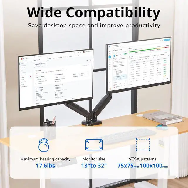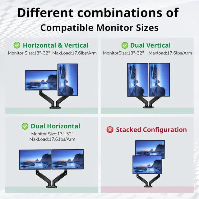 • Universal for 2 MonitorsThis dual monitor stand arm supports a wide variety of models, with each arm compatible with 13 to 32-inch flat or curved screens (VESA 75x75 & 100x100). Each arm securely holds 4.4 to 17.6 lbs. Fits most desks, including wood surfaces, with a recommended thickness range of 0.39 to 3.15.