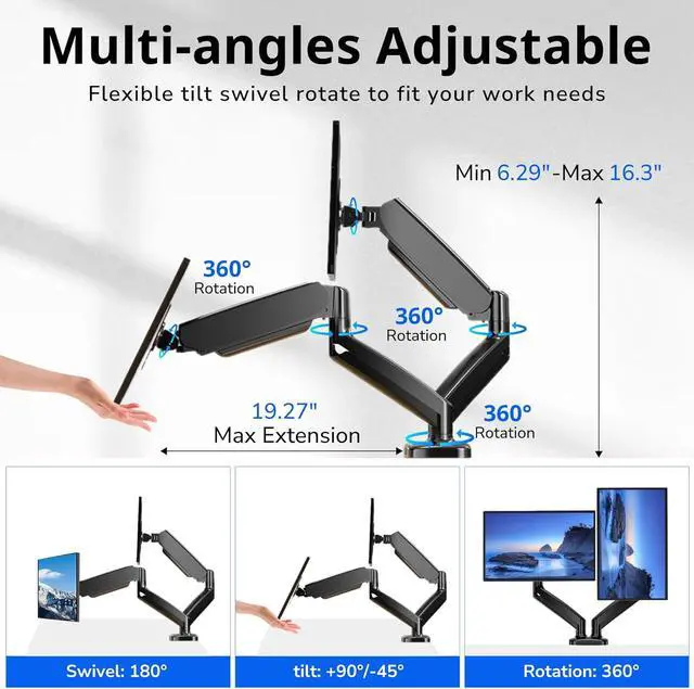 • Fully Customizable Positioning Easily adjust your monitors to the perfect viewing angle with smooth tilt (-45° to +90°), 180° swivel, and 360° rotation. The sturdy design prevents wobbling, tilting, or slipping, while promoting better posture to reduce neck and eye strain for more focused work.