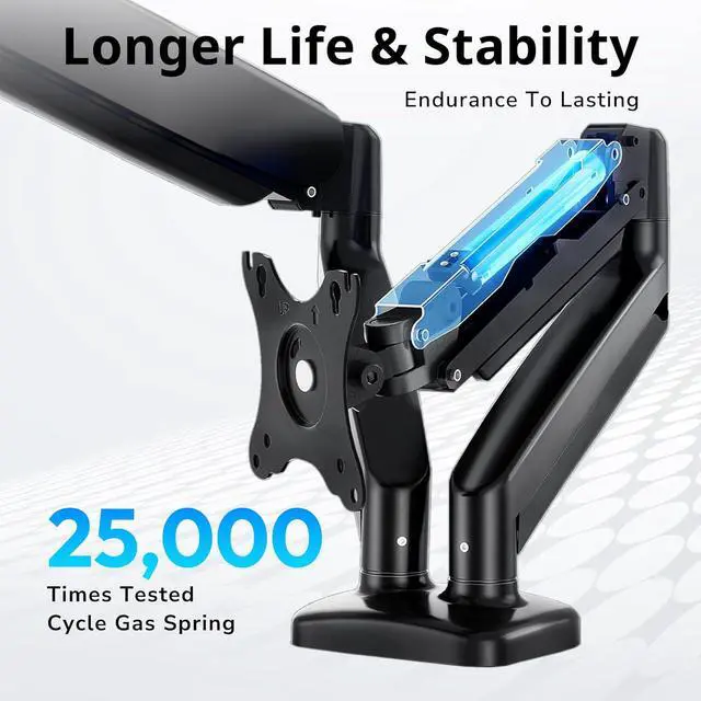 Durable Gas Spring ConstructionEquipped with advanced gas spring technology, each arm automatically adjusts tension based on your monitors weight. Factory-tested through 25,000 cycles, it offers reliable, effortless adjustments and long-lasting stability.