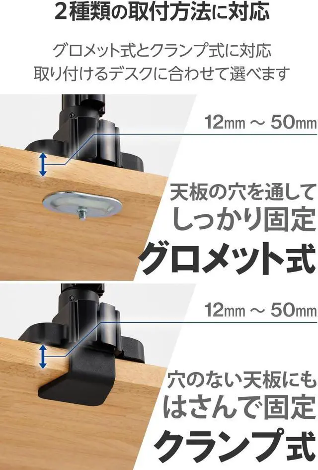 You can choose between 2 mounting methods: Clamp-on to hold onto your desk top and grommet top to secure it through the bolt. The top plate is usually fixed with your hands under the top plate, but this product is easy to fix from the top