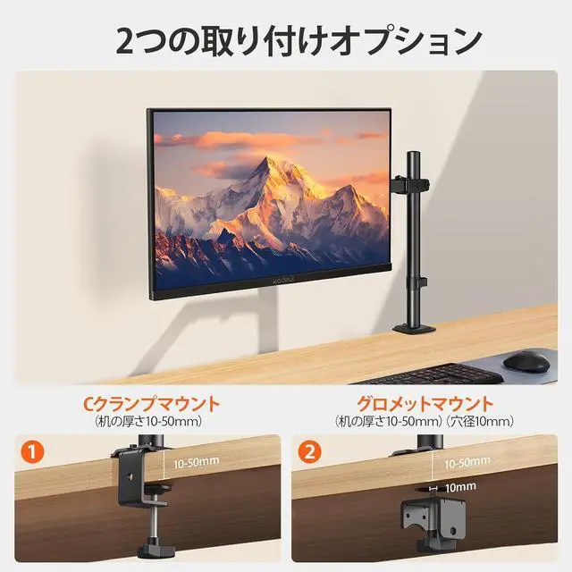 Easy to Assemble and InstallTwo mounting options: "C" clamp fixation and grommet fixing. For 10mm to 50mm thickness desktop, the grommet fixing is suitable for tabletops with a bolt hole (10mm hole diameter) Visit video and assembly instructions for more information