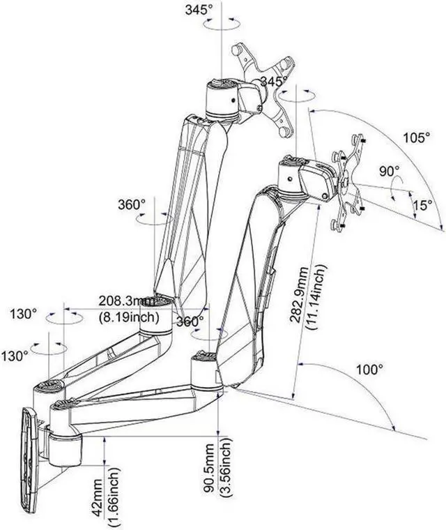 Weight Capacity: Supports 4.4 - 19.8lbs (2 - 9kgs); Tilt: 105°; Rotation: 360° (portrait and landscape positioning)); Swivel: Max 180°; Mounting Pattern: VESA compliant: 75x75 and 100x100; Maximum extension: 15.75-Inch (400mm); 10.6-Inch Height adjustment
