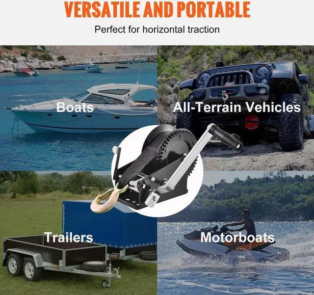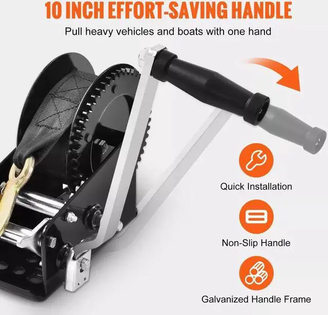 1. Your new sidekick for tough pulls our hand winch. With a 3500 lbs capacity, 33 ft strap, 4:1 / 8:1 dual-speed two-way ratchet, and 10-inch easy-grip handle, it's ready to be your on-the-go traction pro.