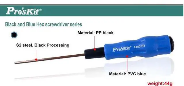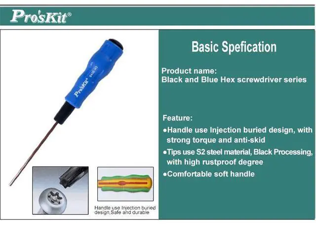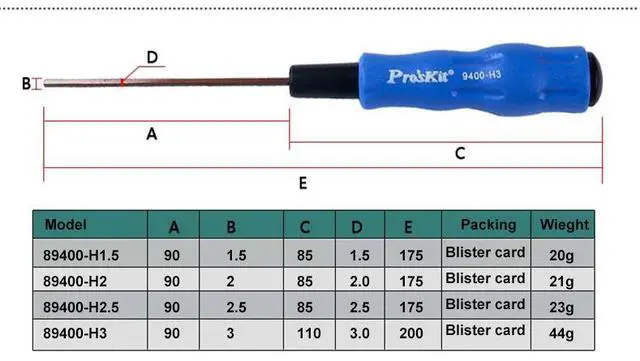 Model A B C D E Packing Wieght 89400-H1.5 90 1.5 85 1.5 175 Blister card 20g 89400-H2 90 2 85 2.0 175 Blister card 21g 89400-H2.5 90 2.5 85 2.5 175 Blister card 23g 89400-H3 90 3 110 3.0 200 Blister card 44g Black and Blue Hex screwdriver seriesHandle use Injection buried design, with strong torque and anti-skidTips use S2 steel material, Black Processing, with high rustproof degreeComfortable soft handle
