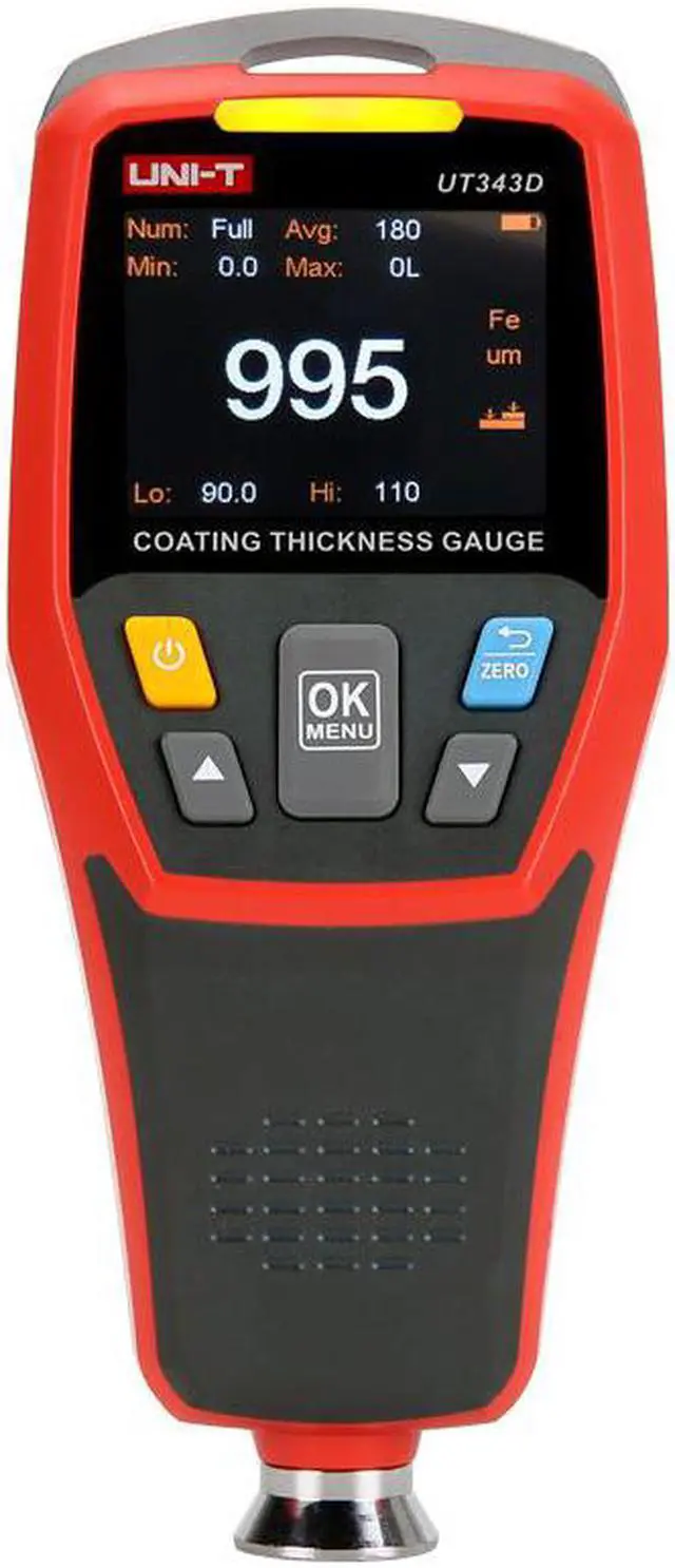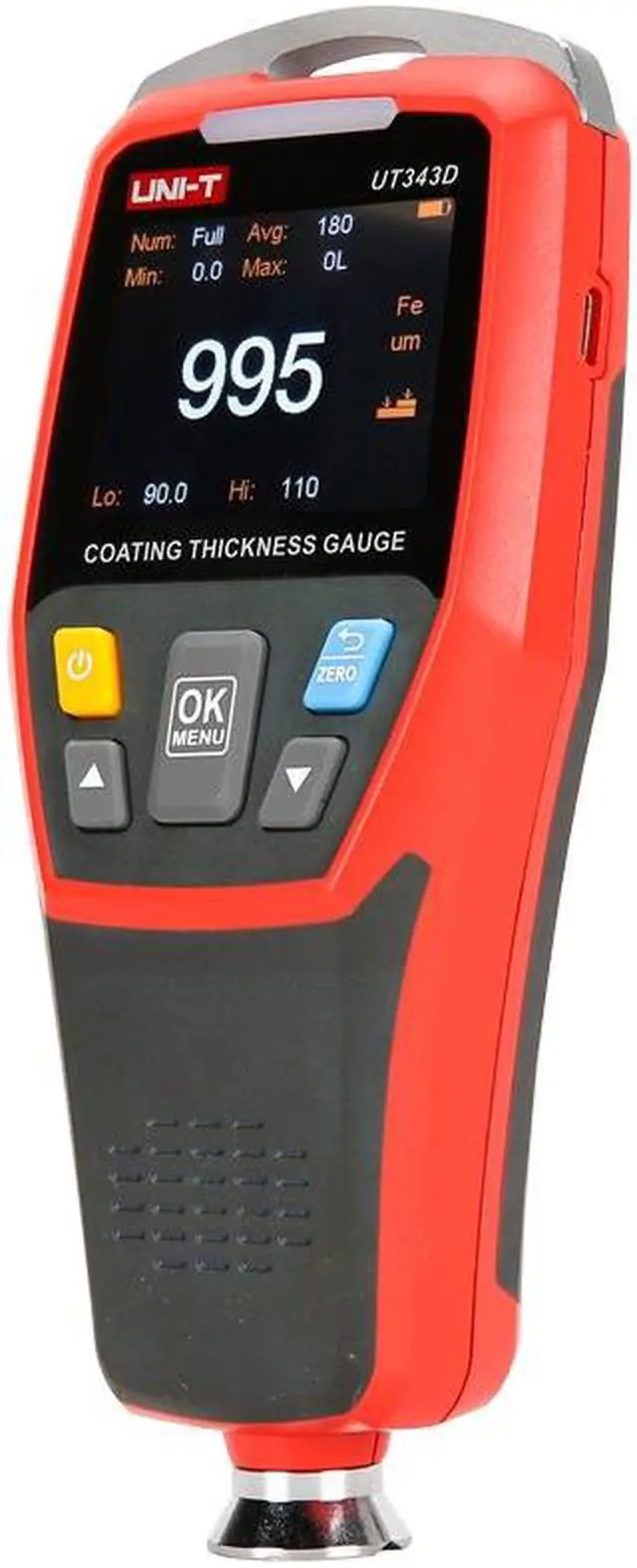 The UT343D Coating Thickness Gauge is a high performance composite coating thickness gauge with integrated iron matrix (FE) and non-ferrous matrix (NFE) measurements. The product has the characteristics of high precision, stable and reliable performance, no damage measurement, and also has the functions of single point, multi-point averaging algorithm and rapid judgment of industrial products. The products are based on the principle of electromagnetic induction and eddy current measurement to detect magnetic metal coating and Non-magnetic metal coating thickness. It is an essential instrument for automobile manufacturing, sales, evaluation, and metal processing, painting, inspection and other industries. It is widely used in manufacturing, metal processing, aerospace, marine, motor train, scientific research, quality inspection, etc. Automatic identification of iron and non-ferrous substrates The sensor uses diamond clamping technology, which is accurate, wear-resistant and stable. Single point and two point calibration to ensure measurement accuracy Single point, multi-point quick judgment and prompt Red, green and yellow warning lights The screen display content is automatically rotated 500 sets of storage data and USB data transmission