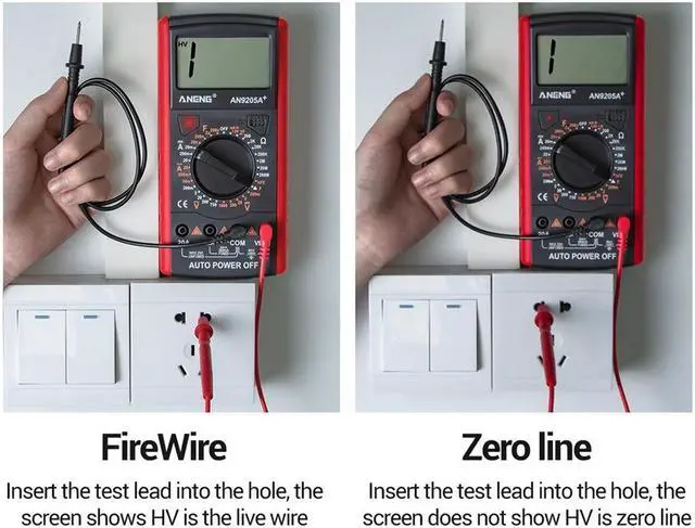 - Zero/Fire Wire Identification: Insert the test lead into the socket, the screen displays HV, which means that it is the live wire.