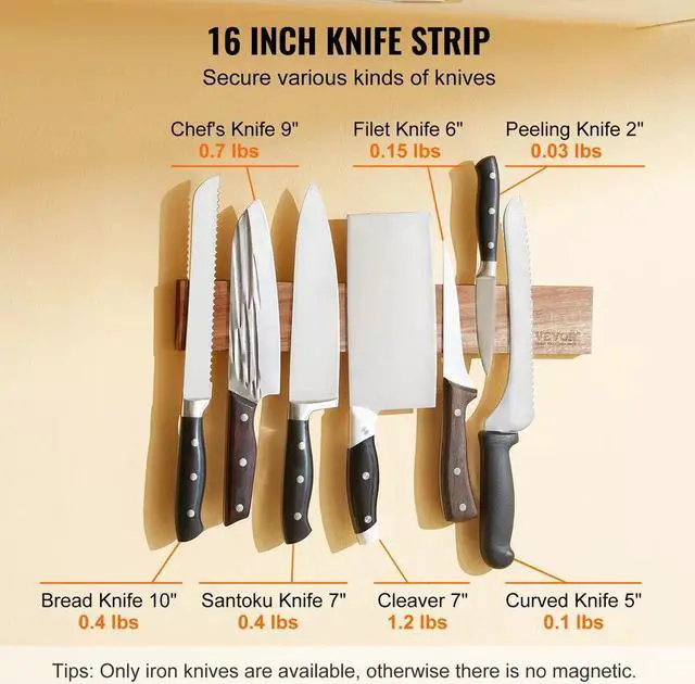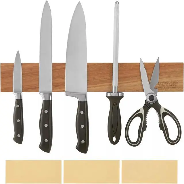 1. Thanks to its double-row strong magnets, there's no need to worry about knives falling off. This storage solution makes it easier, faster, and more secure to store knives. You can finally say goodbye to cluttered countertops and the hassle of searching through drawers for the right knife.