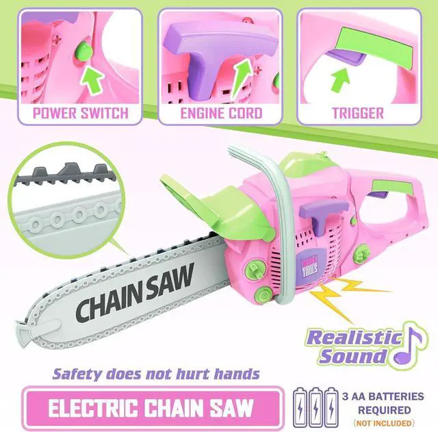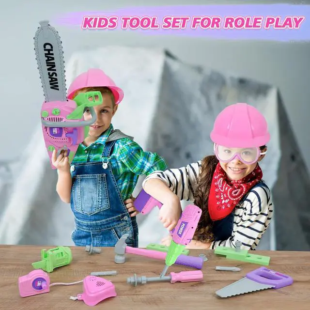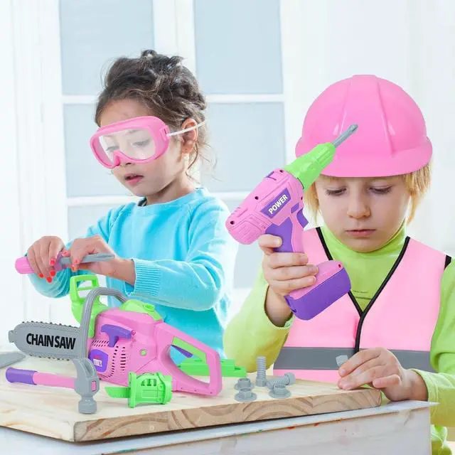 Kids Tool Set: This pink toy set includes a pretend Electric Chainsaw, an Electric Drill, a Working Vest, 3 types of replaceable bits, a saw head, a real tape ruler, a Hammer, a Hand Saw, a Helmet, a Safety Goggles, a Mask, screwdriver, nuts, and bolts, hole blocks. A pretend play toy that really allows children to play carefree. Kids can roleplay games for hours with their parents.
