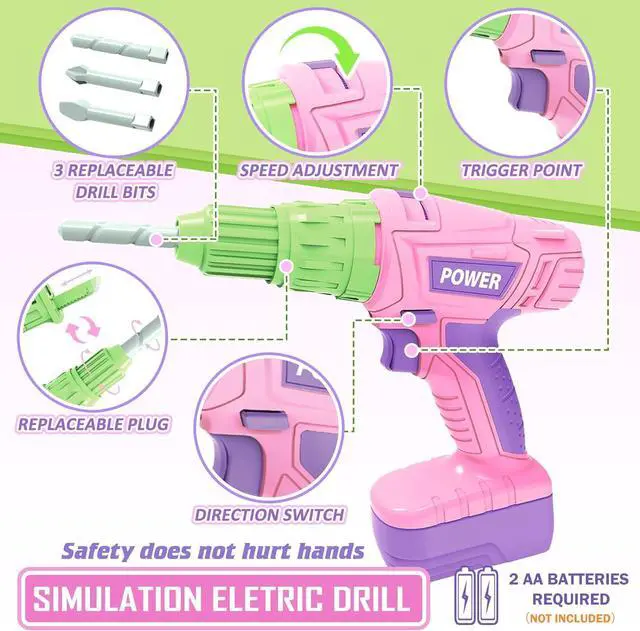 Realistic Electric Tools: Children imitate their father in repairing. The electric kid's power tools kit is battery-powered (batteries not included) The toddler toy drill comes with 3 interchangeable drill bits and can be switched to a cutting saw head for different functions. It can simulate sound and movements like real tools, which is more attractive and develops kids' imagination. The realistic features help them to role-play what they may have seen their parents doing with similar tools.