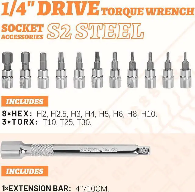 . 3*Torx: T10, T25, T30. 1*Extension Bar(4''/10cm), protective molded case for safe storage of bike torque wrench and tool bits. Widely used in bicycles repair, household appliances, installation equipment, and product assembly.